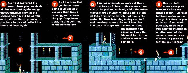 Through all this, the animation is wonderful. All the movement is so detailed that you can make your playing character run over three tiles at a time, walk across single tiles or stop dead. To climb up ledges, you simply push the joystick up and your hero thrusts his arms into the air and pulls himself upwards. If you look like tumbling off a ledge, you can even thrust out your arms and grab onto the precipice - if you're quick. When it comes to jumping, you can either leap from a standing start or take a running jump over bigger gaps. It's all beautifully realistic - but you do need to exercise all these moves to work your way through the castle. In one of the screens on level one, for instance, you need to walk carefully over one switch to cause a portcullis to rise, then leap over the next two tiles - the first tile falls beneath you if you stand on it and the second causes the portcullis to drop before you can reach it.