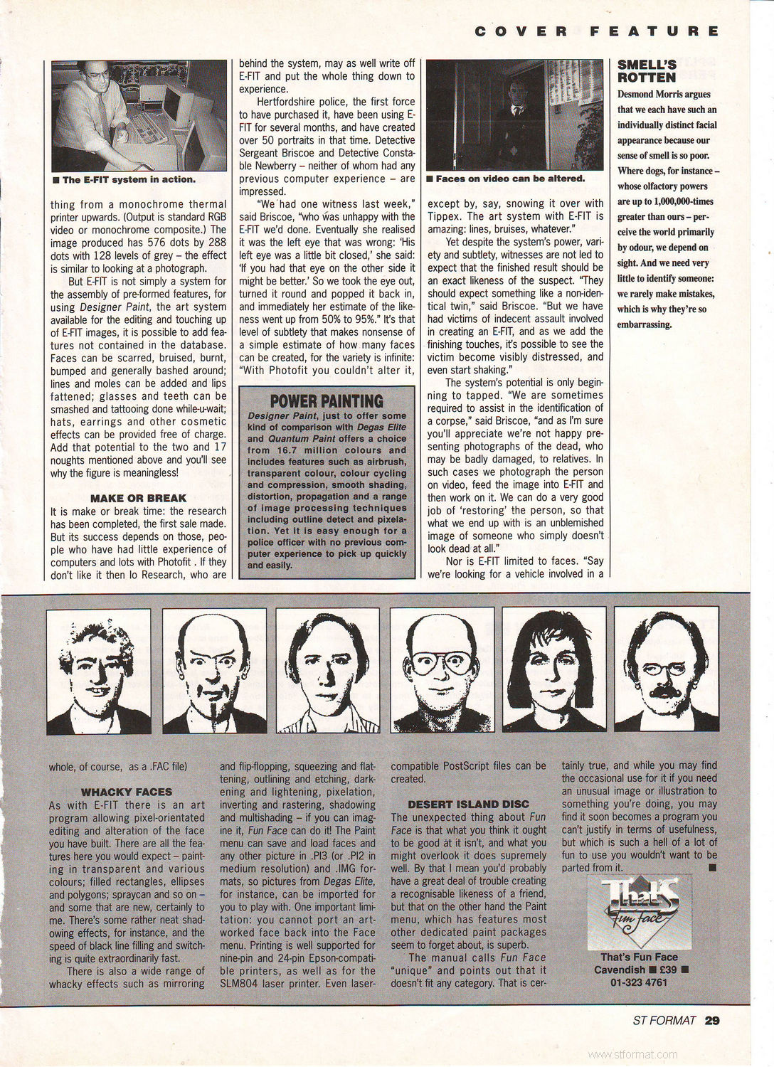 It's a fair cop, guv, I'll come quiet: STEVE CAREY investigates how the police can fit you up for a crime with the amazing new E-FIT system, and on page 28 reviews That's Fun Face, a unique new kind of ST program that works in the same way. |